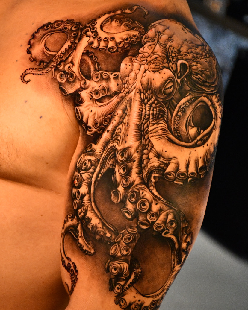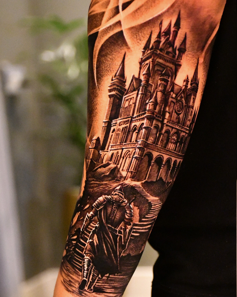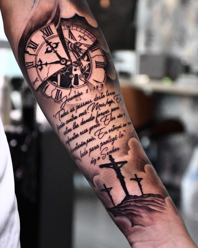 Com tudo alinhado, inicio o desenho. Aqui entram referências, narrativa, equilíbrio de luz e sombra, e a forma como a arte se encaixa no corpo. É o momento onde estilo, técnica e simbolismo se encontram para criar algo que só você terá.