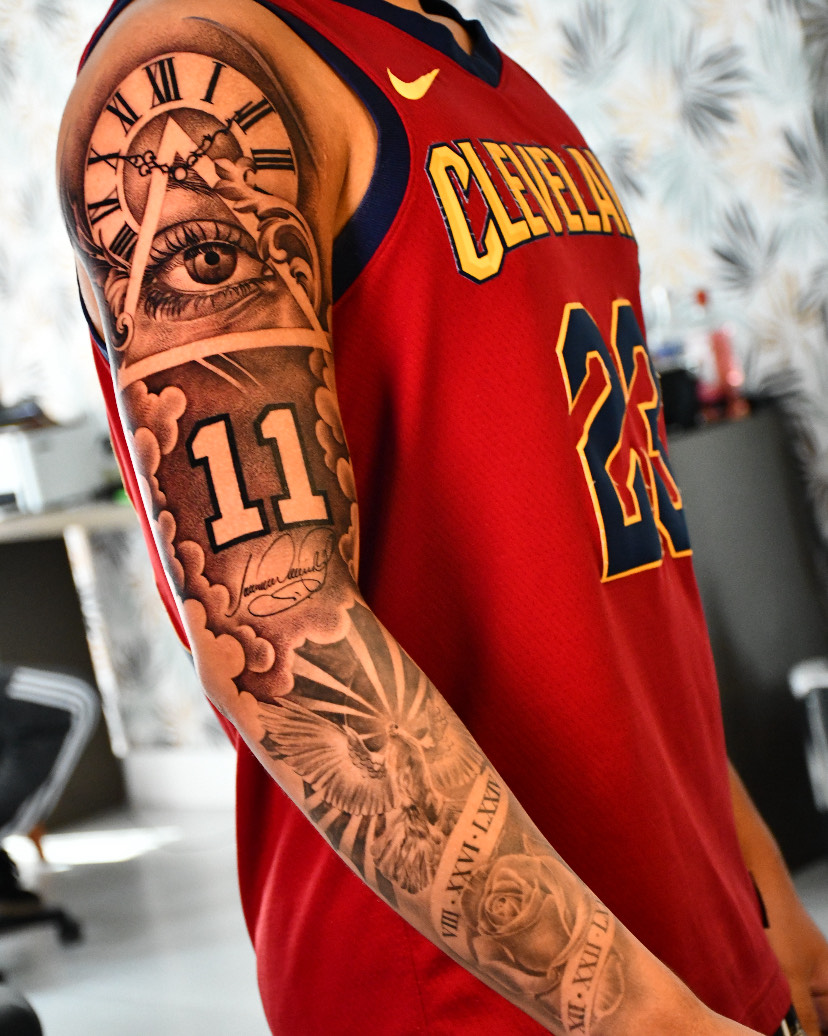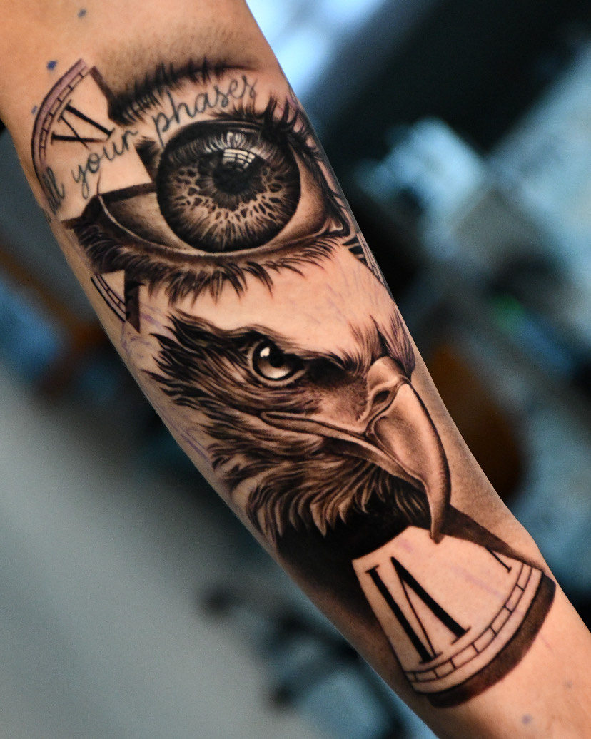 Antes de qualquer traço, eu analiso a área que você vai tatuar - anatomia, curvatura, movimento e impacto visual. Em paralelo, absorvo a sua história, o conceito e o sentimento que quer traduzir. É daqui que nasce a base do projeto.
